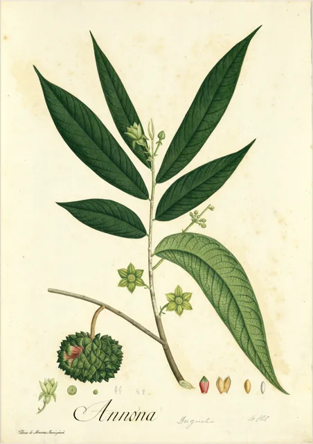 El Anón (Annona squamosa) es un árbol de porte pequeño a mediano, que generalmente no supera los 6 a 8 metros de altura, presentando una estructura ramificada y un crecimiento que se adapta perfectamente a entornos tropicales. Sus hojas son de disposición alterna, con una forma oblongo-lanceolada, midiendo entre 5 y 17 cm de longitud y entre 2 y 5 cm de ancho; su color es un verde intenso en la cara superior y un tono ligeramente más pálido en el envés, con una textura coriácea o ligeramente áspera al tacto.