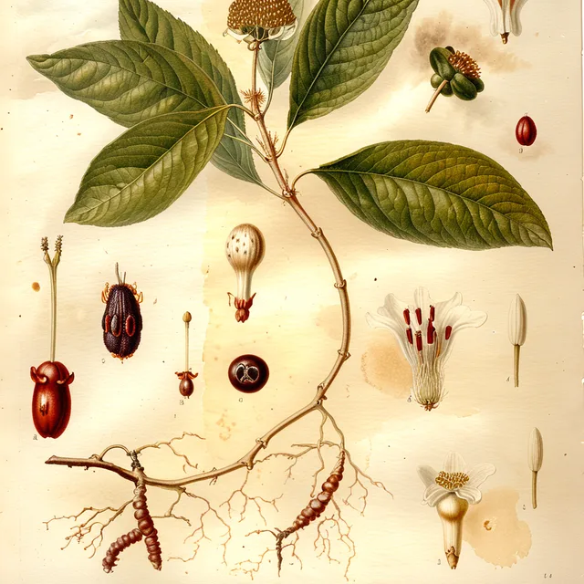 La Ipecacuana (Cephaelis ipecacuanha), perteneciente a la familia Rubiaceae, es una planta herbácea o subarbustiva de carácter rizomatoso que posee un hábito de crecimiento trepador, utilizando troncos de árboles en la selva para sostenerse. Su estructura puede alcanzar una altura aproximada de 0.5 metros, aunque su crecimiento es notablemente lento. La planta se caracteriza por tener ejes que pueden ser levemente pubescentes (con vellosidades finas) o glabros (completamente lisos).