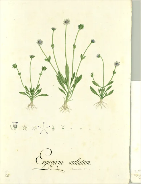 Las inflorescencias son cabezuelas ovoides a cilíndricas de 1 a 2 centímetros, rodeadas por brácteas espinosas. Las flores son diminutas, de color azul, violeta o blanco, densamente agrupadas. La floración ocurre entre julio y octubre.