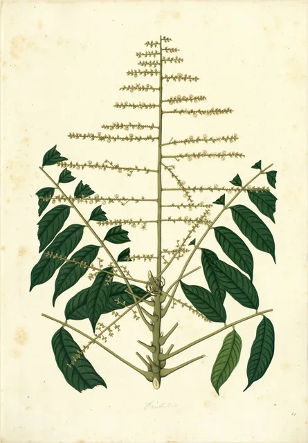 Sus hojas son de tipo compuestas y trifolias, lo que significa que cada hoja principal se divide en tres folíolos o pequeñas láminas dispuestas de forma alterna a lo largo del tallo; estas láminas miden entre 3 y 15 cm de largo y 2 a 10 cm de ancho, con un pecíolo (el tallo que une la hoja al tronco) de 7 a 15 cm. La floración es uno de sus rasgos más espectaculares, manifestándose en racimos de 10 a 30 cm de longitud que albergan flores hermafroditas (que poseen órganos masculinos y femeninos a la vez).