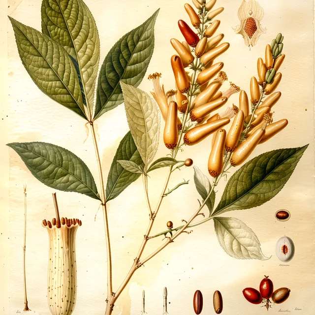La Cuasia (Quassia amara) es un árbol de la familia Simaroubaceae que se caracteriza por su porte arbóreo, alcanzando alturas que pueden variar significativamente dependiendo de su entorno, aunque comúnmente se presenta como un árbol de tamaño mediano a grande en los bosques tropicales. Su estructura es esbelta y su follaje es denso. Las hojas son una de sus características más distintivas: son compuestas, de forma pinnada, con folíolos que presentan una textura coriácea (similar al cuero) y un color verde intenso que les otorga una apariencia saludable y vibrante.