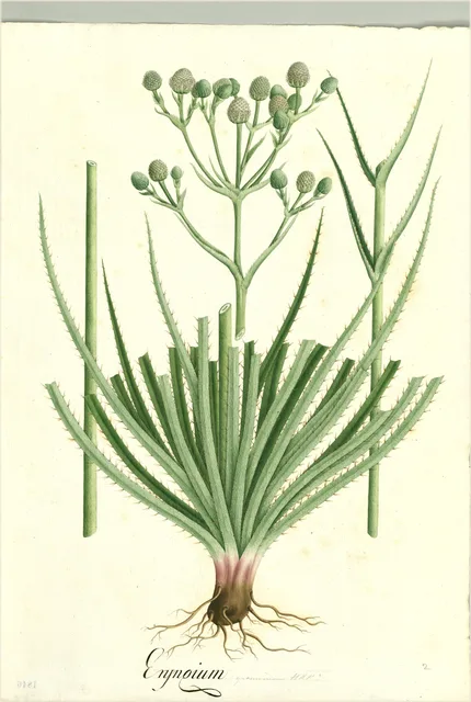 El tallo floral emerge del centro de la roseta como un escapo erecto, dicotómicamente ramificado en la parte superior, de hasta 40 centímetros de longitud. Las inflorescencias son cabezuelas cilíndricas pequeñas de 1 a 2 centímetros de largo, rodeadas por brácteas foliáceas espinosas protectoras. Las flores son diminutas, verdosas a blanquecinas, pentámeras. Los frutos son esquizocarpos ovoides de aproximadamente 2 milímetros cubiertos de escamas papilosas.
